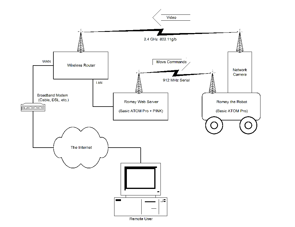 The Romey Web Server makes web-based telepresence possible. Because we are using an off the shelf network camera, the seeing part of telepresence (video) is relatively straight forward. The camera has a built-in web server that sends its video data through your wireless router using 802.11b/g Wi-Fi and then out to the web browser. The real work is in sending commands back that are used control Romey’s movements. Since I wanted to use a web browser to do this I built a small web server of my own that receives commands from the web browser and then translates them into commands that get sent to Romey via the 912 MHz link.